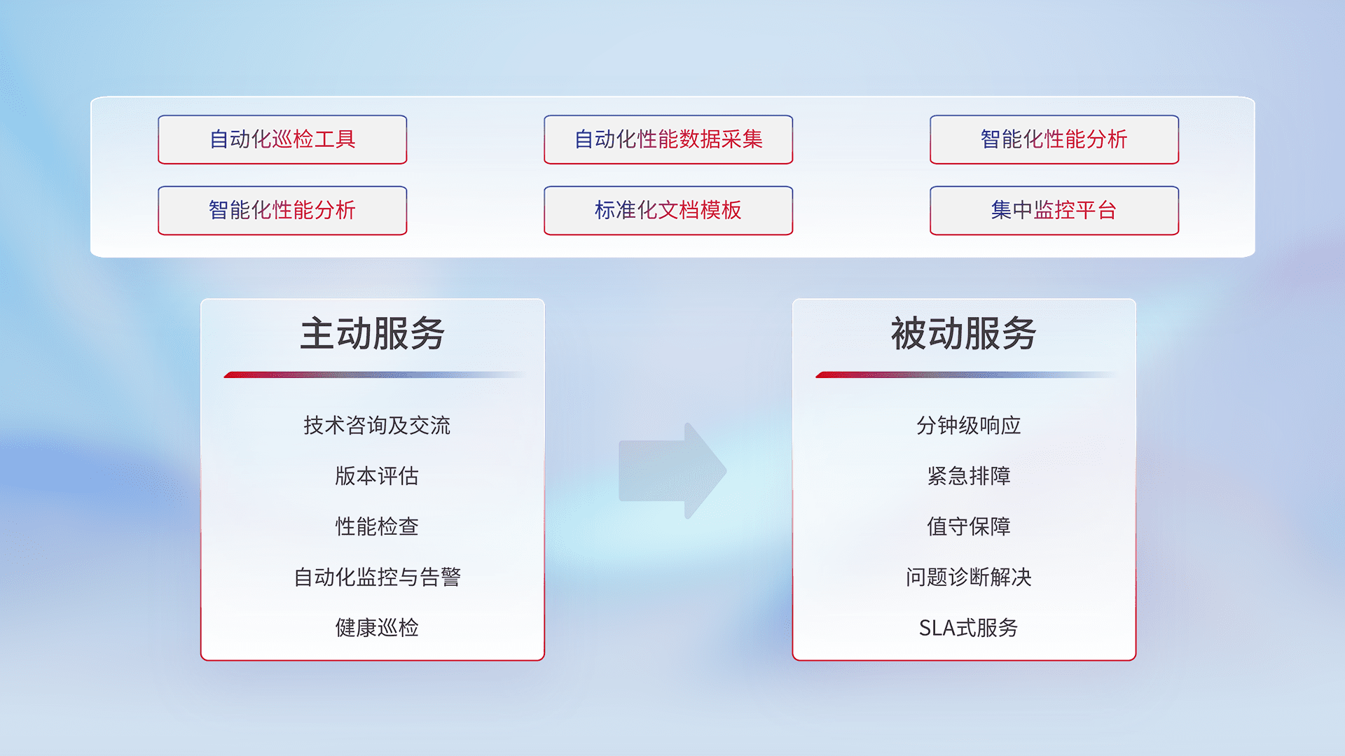 智能化工具和标准化文档,,,,保障服务质量,,,提供主动服务(包含技术咨询、、、版本评估、、、性能检查、、、、自动化监控与告警、、、健康巡检)和被动服务包含(分钟级响应、、、紧急排障、、、、值守保障、、、问题诊断解决、、SLA服务)。。。